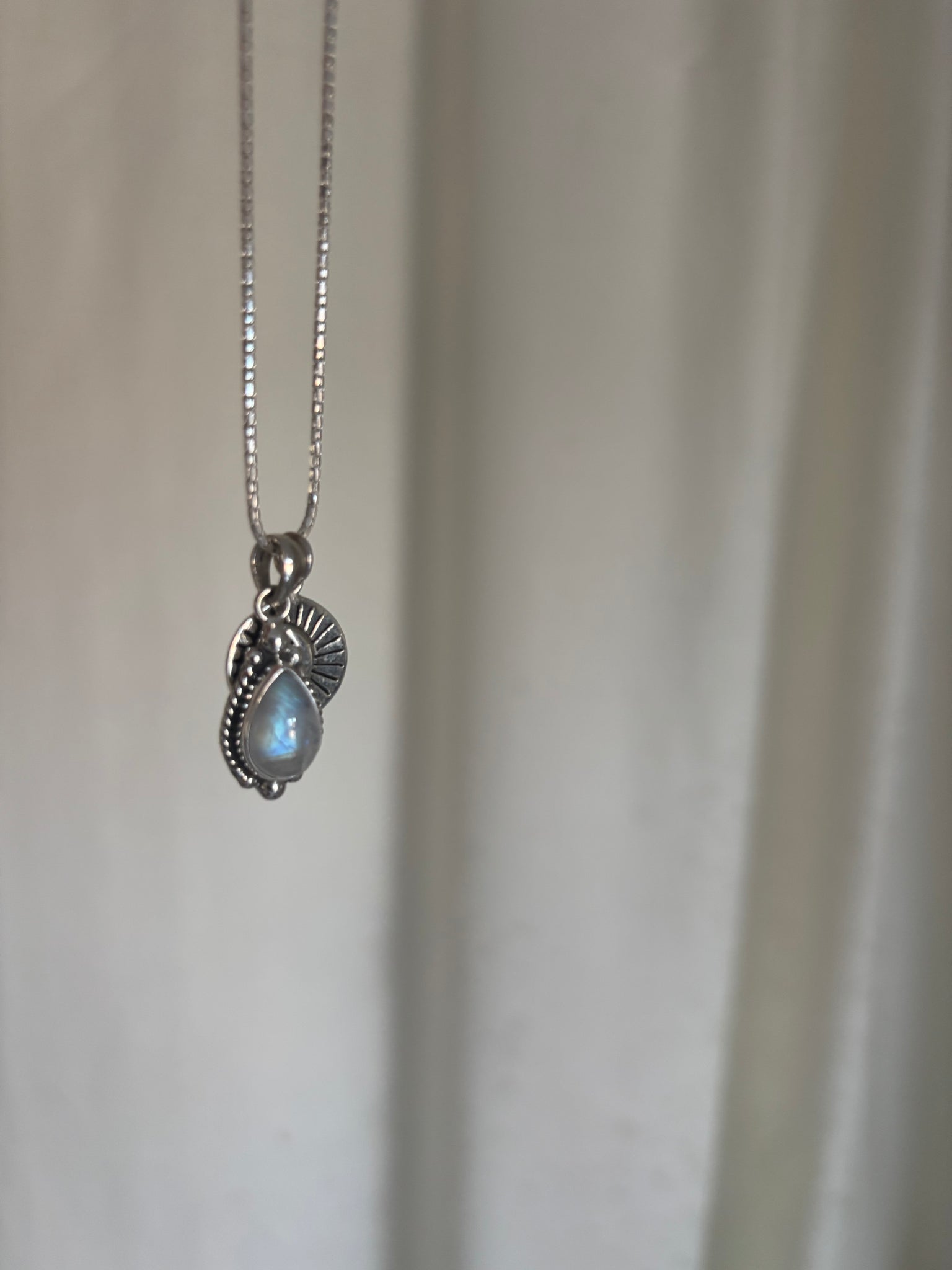 Moonstone droplet with sterling silver Crescent Moon disk sent on a 16inch popcorn link chain.