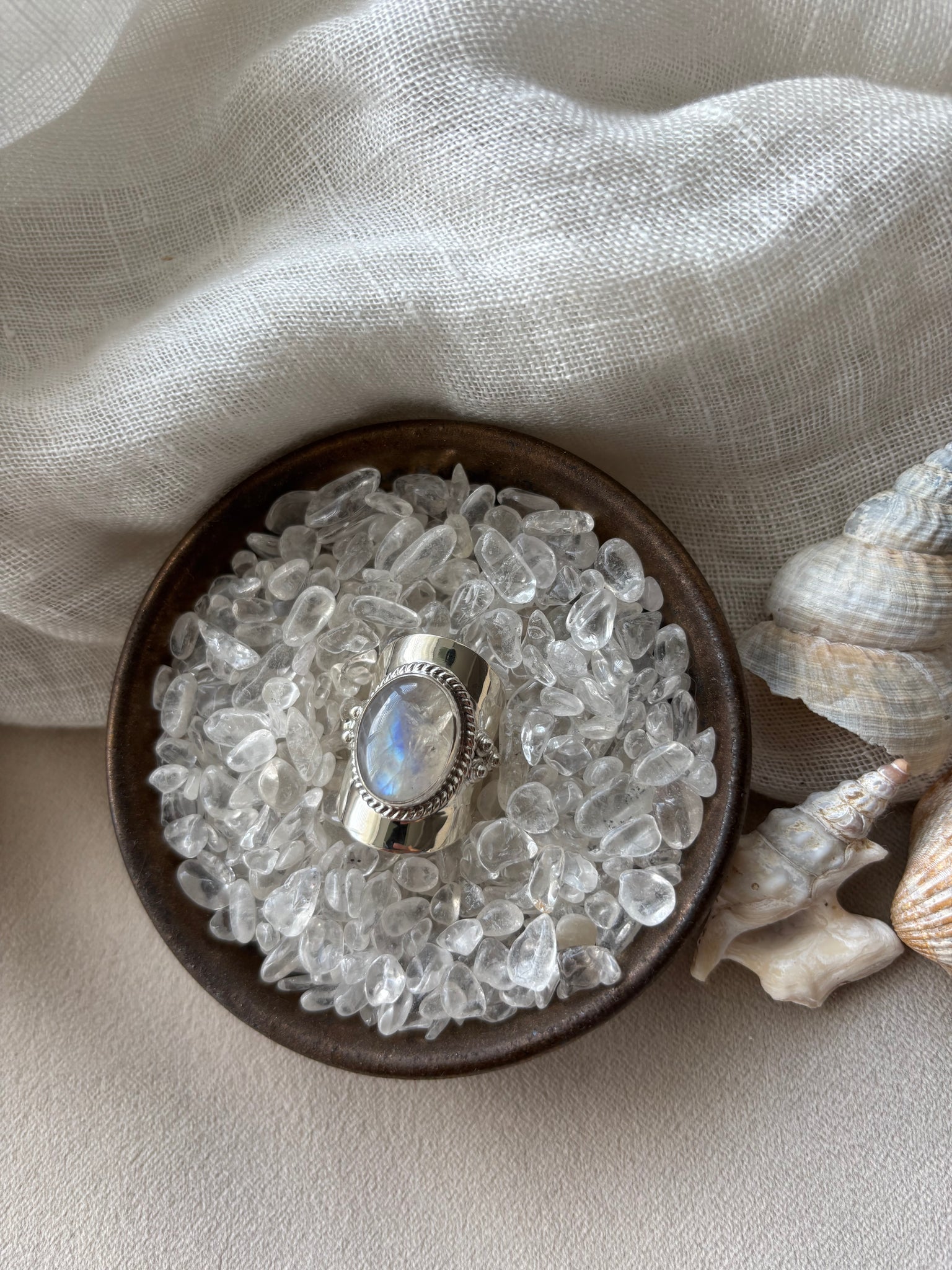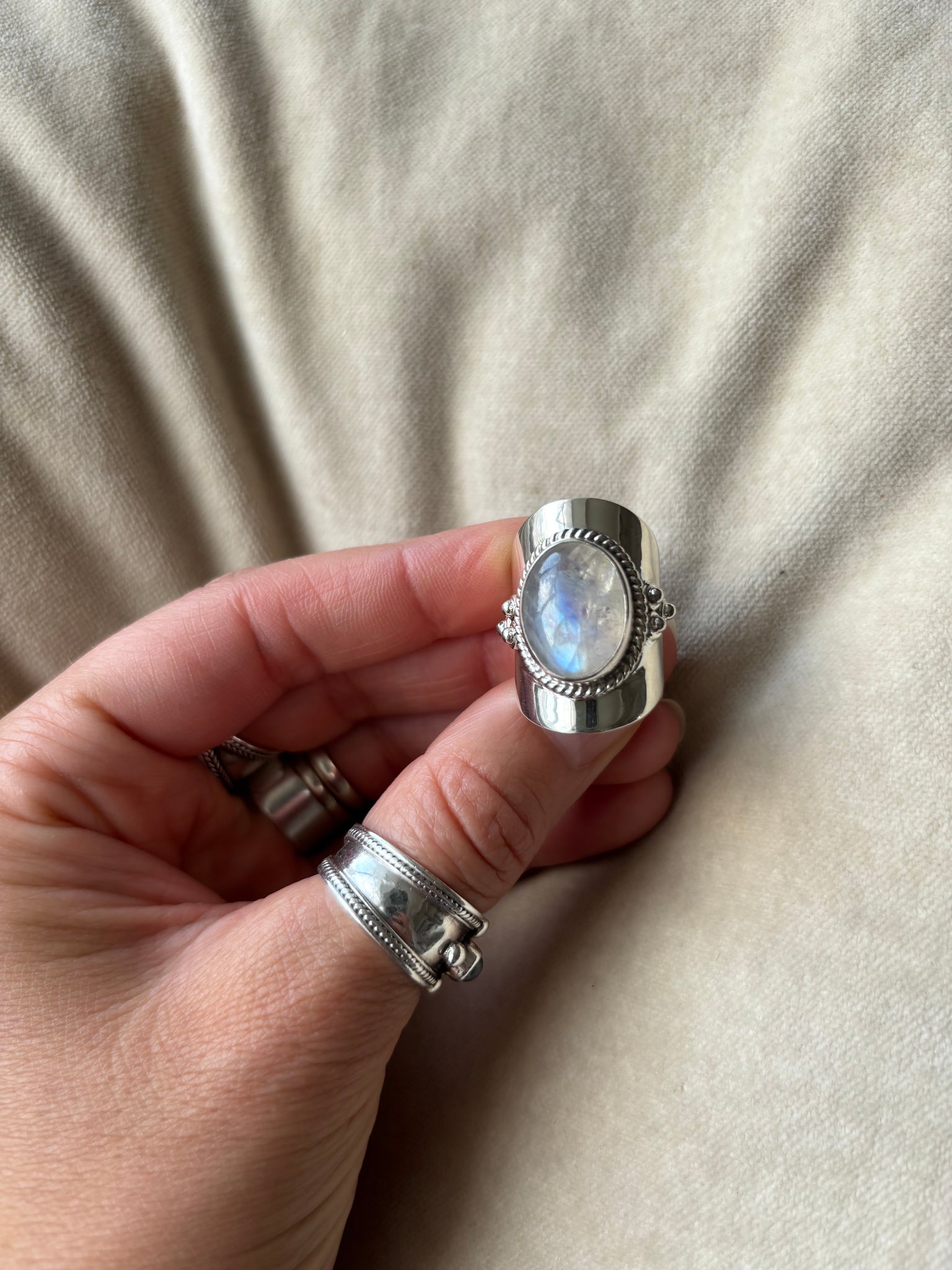 These beautiful large band Full Moon Moonstone rings are the perfect statement band with a flash of bold Moonstone iridescence and energy.